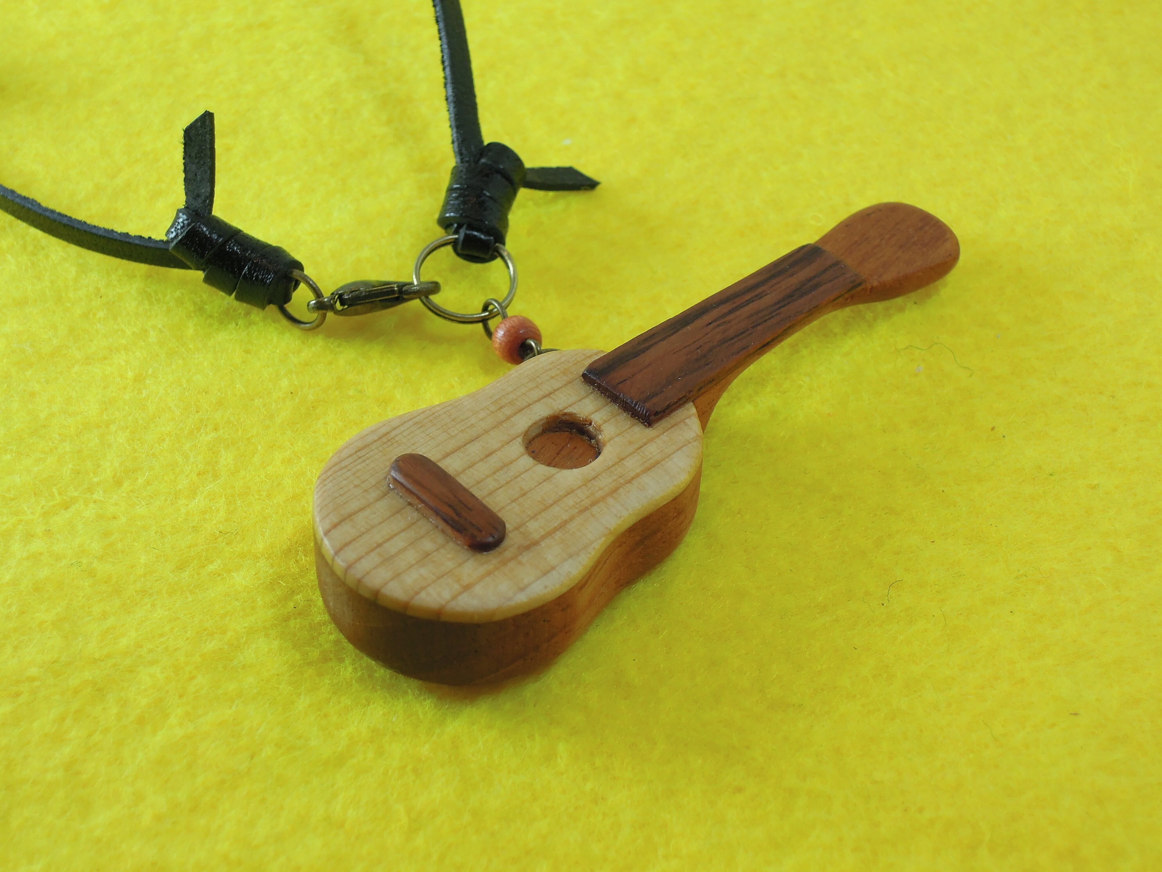 一つ一つ手持ちナイフで削り出して製作しているのですが、このサイズ感に似合わず製作する小物雑貨の中でも1〜2位を争うほど手間と時間がかかります。日常本物の弦楽器を作っているせいか、製作工程・工法にはじまり実際に弾く訳でもないのに各部のフォルムや仕様、手触りなど細かいところが色々気になって余計に手がかかっちゃうんですね。材も実際にウクレレになったものと同じで愛嬌のあるポテっとしたフォルム。ウクレレ好きな方には気に入っていただけるかなと思っております。