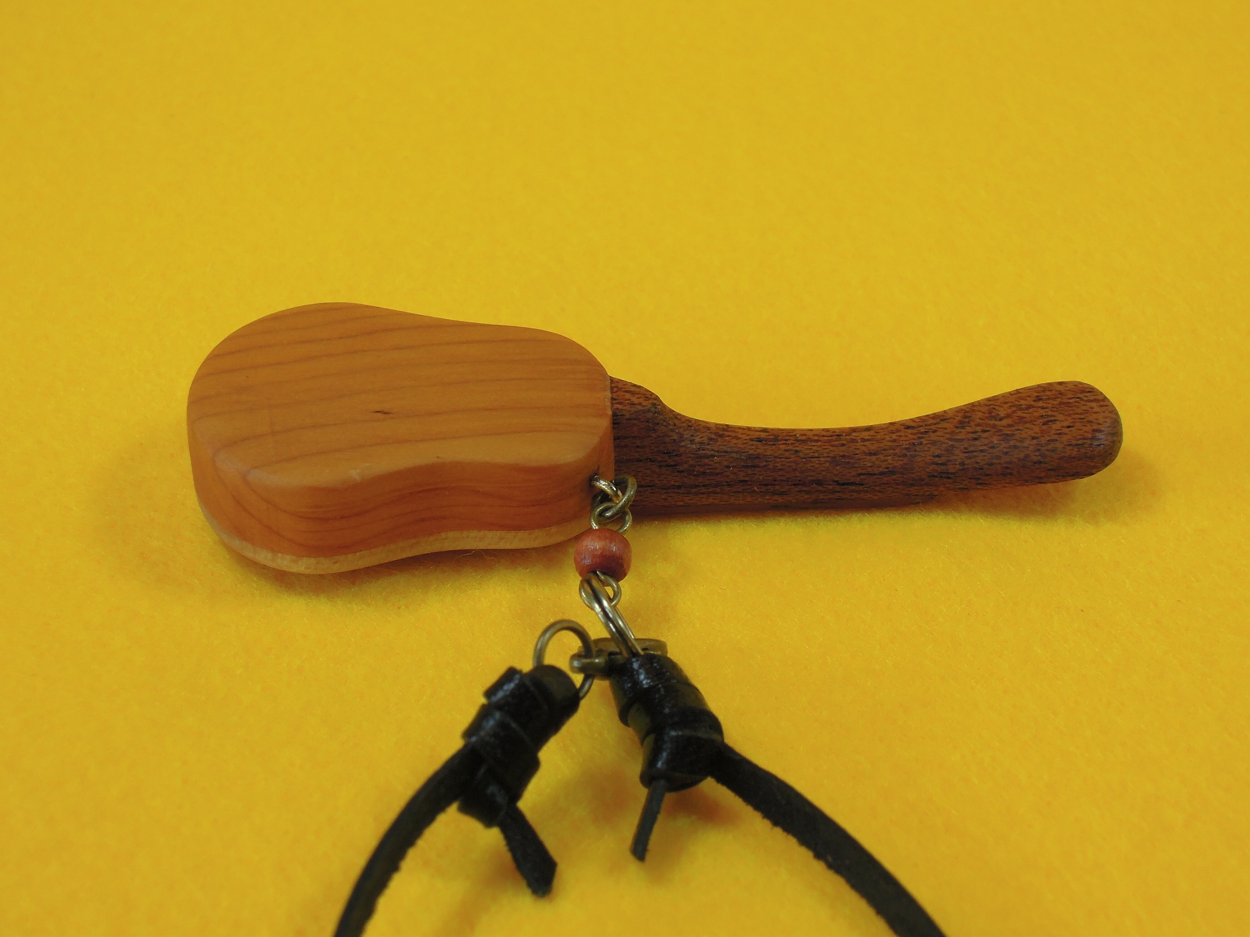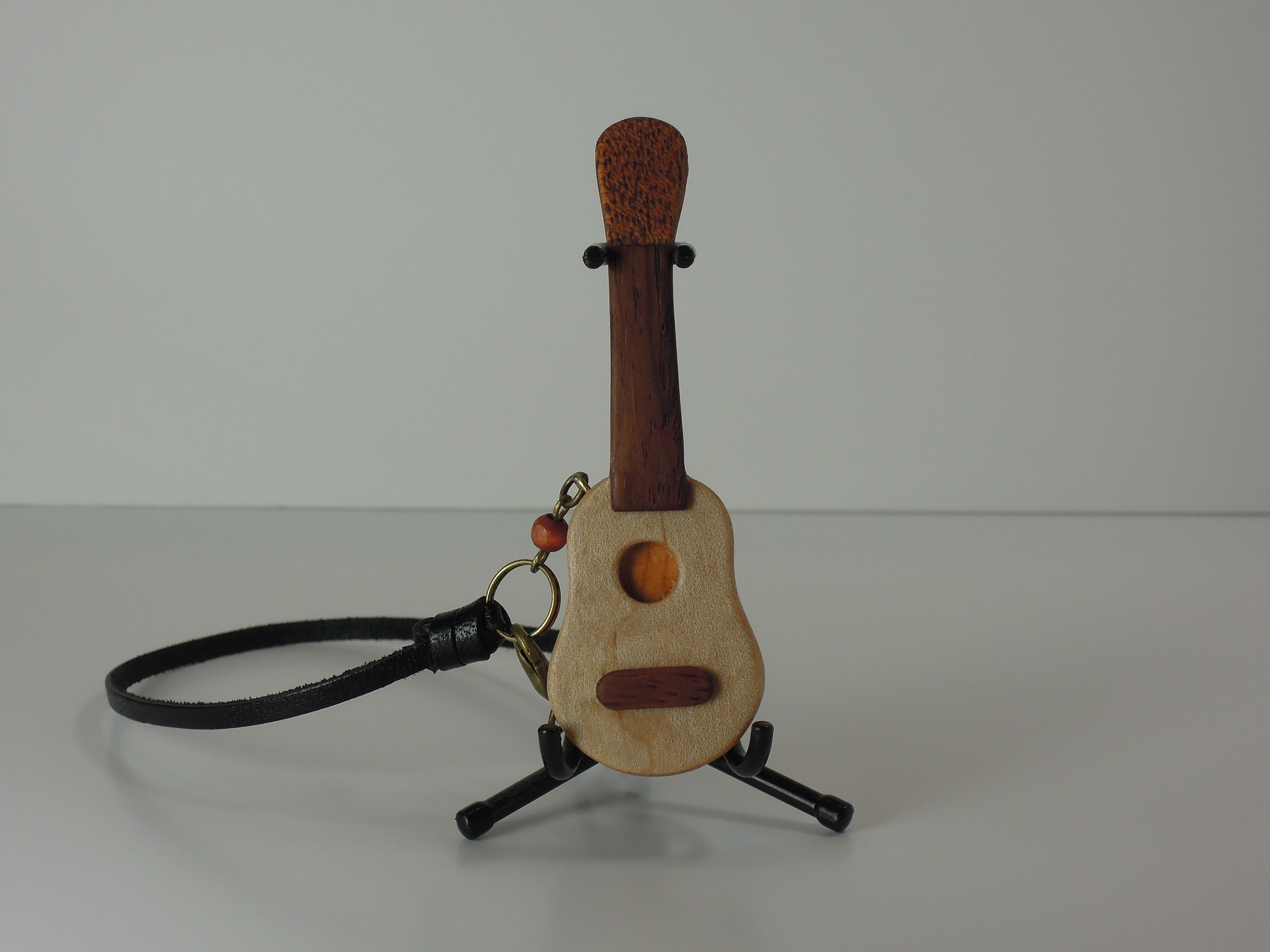 一つ一つ手持ちナイフで削り出して製作しているのですが、このサイズ感に似合わず製作する小物雑貨の中でも1〜2位を争うほど手間と時間がかかります。日常本物の弦楽器を作っているせいか、製作工程・工法にはじまり実際に弾く訳でもないのに各部のフォルムや仕様、手触りなど細かいところが色々気になって余計に手がかかっちゃうんですね。材も実際にウクレレになったものと同じで愛嬌のあるポテっとしたフォルム。ウクレレ好きな方には気に入っていただけるかなと思っております。