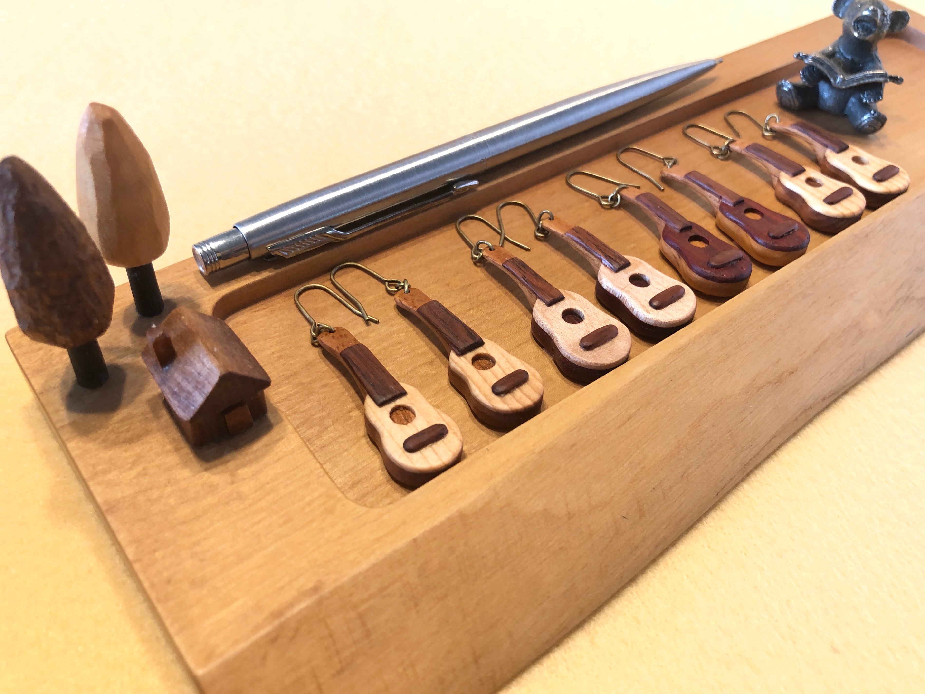 一つ一つ手持ちナイフで削り出して製作しているのですが、このサイズ感に似合わず製作する小物雑貨の中でも1〜2位を争うほど手間と時間がかかります。1−1、1−2など商品名の数字の最初の部分が同じもので一応1対となりますが、手作りのため全く同じではございません。そのため基本的に一つずつのバラ売りとなってます。材は実際にウクレレになったものと同じで愛嬌のあるポテっとしたフォルム。ウクレレ好きな方には気に入っていただけるかなと思っております。またプラス100円でイヤリングへの変更も可能です。その際は配送の欄で「イヤリングに変更」をお選びください。通常のレターパックプラスの520円に変更代100円が加算された料金となっております。配送はレターパックプラスです。